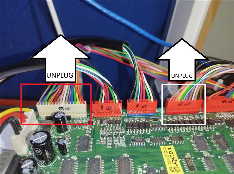 Unplug JP19 and JP20 from the main board and make sure they are clear of other wires in the machine.