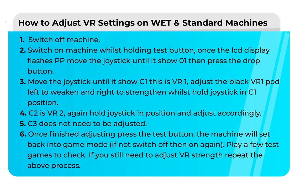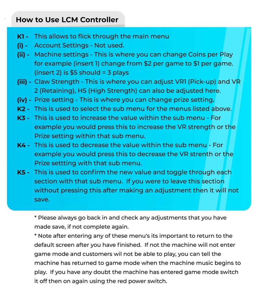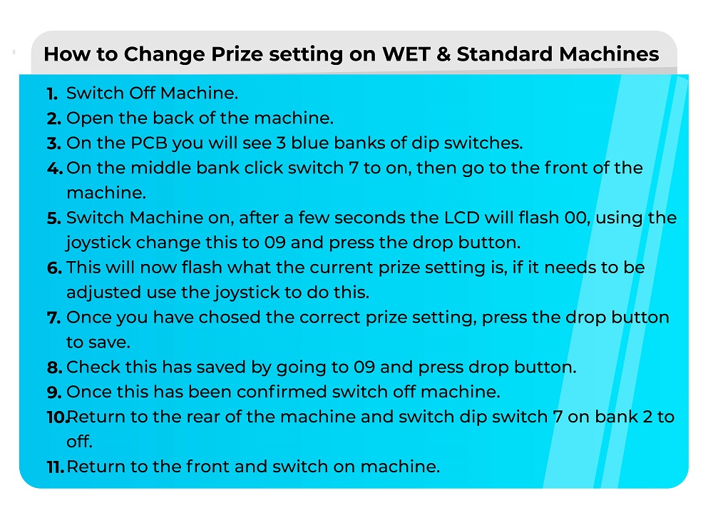 These types of machines are generally, The Claw Large, WET, Standard Machines and older style machines - You will need to adjust the settings within the LCM controller, this can be also found in the centre console.